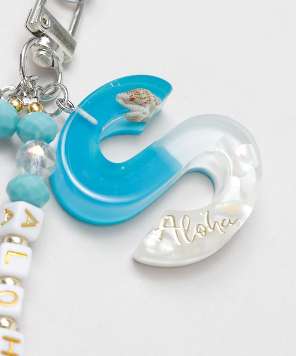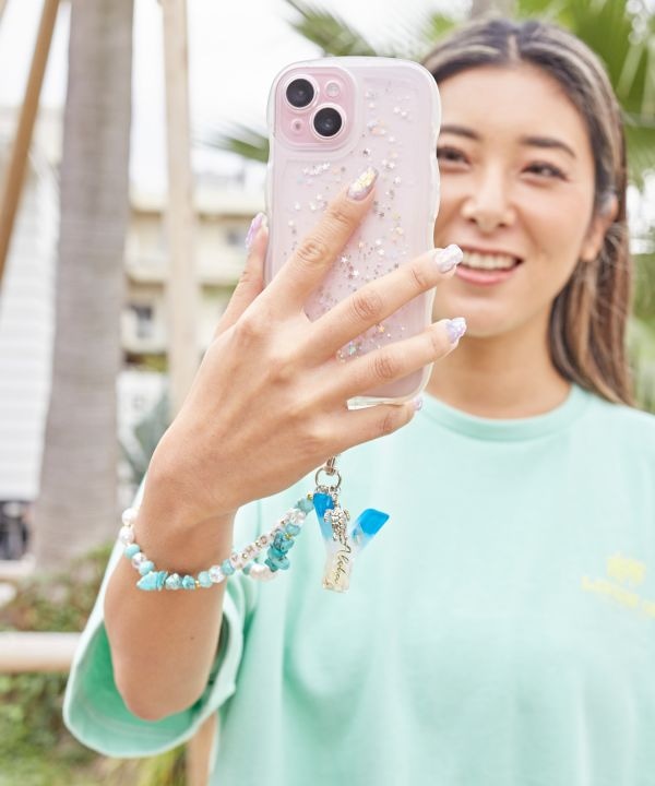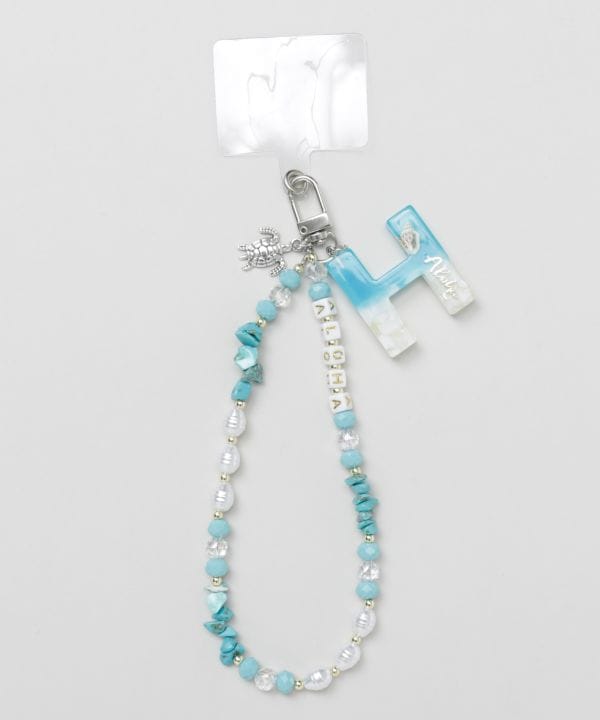 海のきらめきを思わせるビーズが連なるイニシャルスマホストラップ。ハワイの海風を感じるような爽やかなカラーが魅力です。手首にかけられる仕様でスマホをしっかりホールド。大切な人とお揃いで持つのもおすすめです。
