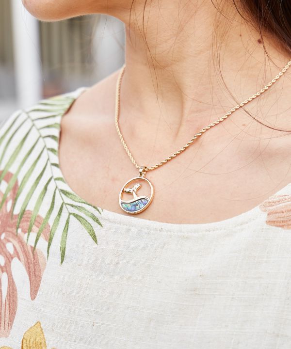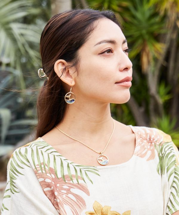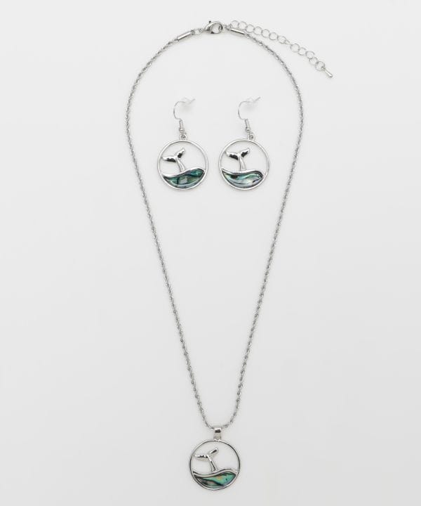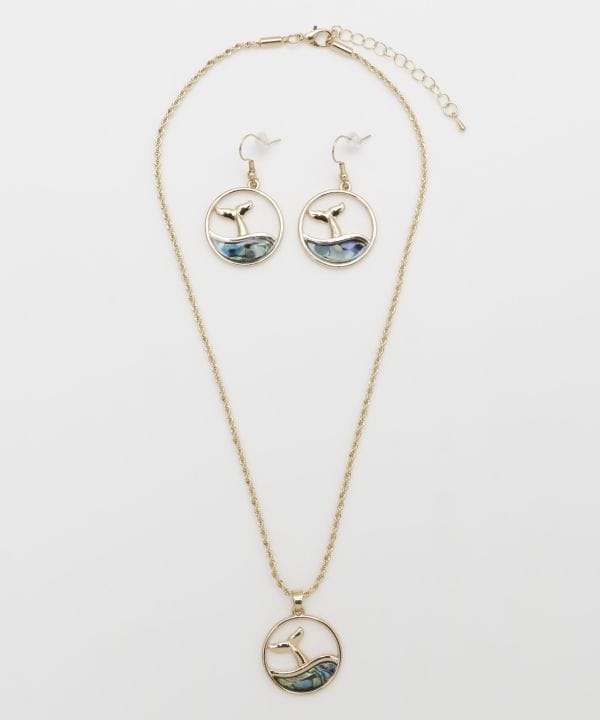 ホエールテールデザインのシェルが煌くネックレスセット。ネックレスとピアスがセットになっており、一緒につけても、別々につけても、その日の気分やコーディネートに合わせてお楽しみください。