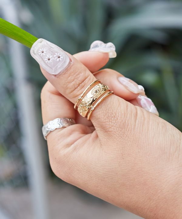 ハワイアンジュエリー調の刻印を施したサム(親指)リング。3連になっているのでボリューム感が出て、幅のあるデザインは身につけるだけで手元をゴージャスに演出してくれます。親指にリングをつければ願いが叶うとも言われており、男女兼用でお使いいただけます。