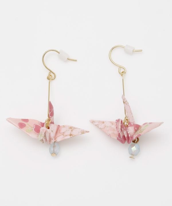 昔懐かしい日本の遊び「折紙」。折り紙を使用した折鶴モチーフのピアス。ひとつひとつ丁寧に折られた鶴が可愛らしい印象。折鶴の部分は樹脂コーティング仕上げが施されています。