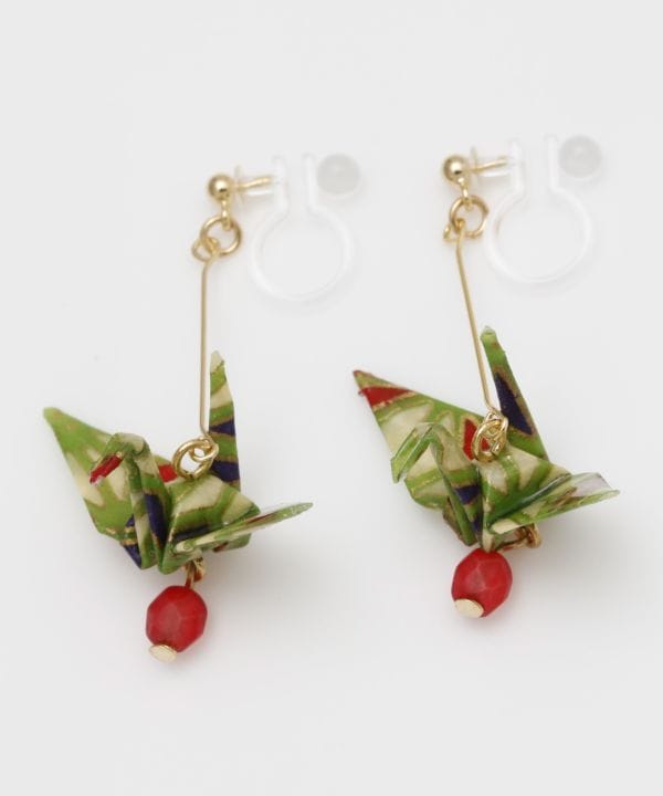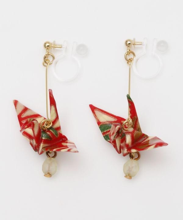 昔懐かしい日本の遊び「折紙」。折り紙を使用した折鶴モチーフのイヤリング。ひとつひとつ丁寧に折られた鶴が可愛らしい印象。折鶴の部分は樹脂コーティング仕上げが施されています。