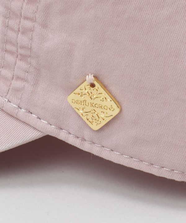 シンプルなデザインのくすみカラーのキャップ。落ち着いたカラーでやわらかな印象に。サイドに付いたメタルパーツがワンポイント。