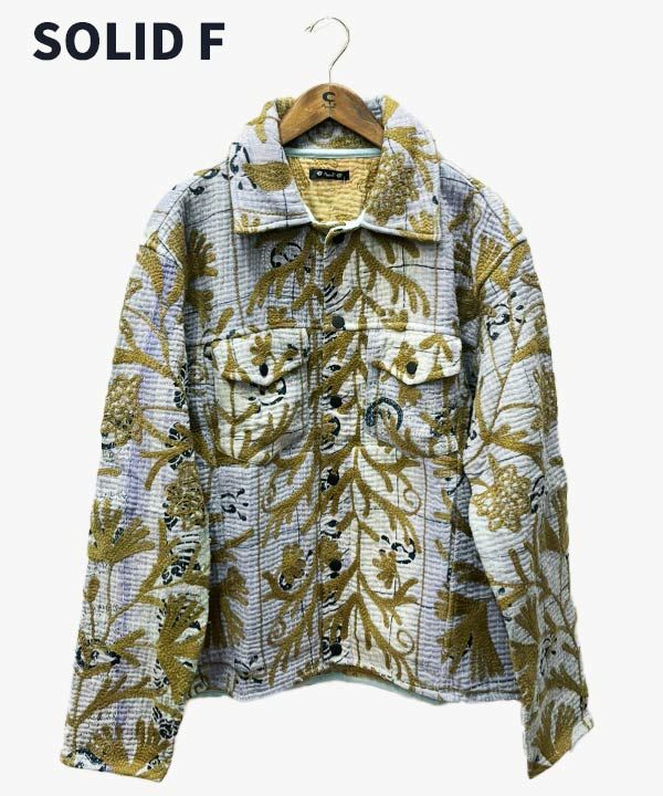 《世界に一つしかない一点もの》インドの約50〜70年前のビンテージ布「カンタ」をリユースして、刺繍と共にリメイクしたジャケット。「カンタ」とはインドなどで古くから伝わる伝統的な刺し子刺繍の布のこと。大切に使われた古布を重ねて刺し子刺繍を施すことで、より魅力的な新しい布として蘇ります。作り手の感性で新しく生まれ変わったジャケットは、一つとして同じものはありません。バイヤーがひとつひとつチェックし、この特別な一点ものジャケットを仕入れてきました。脈々と受け継がれる伝統、ハンドクラフトの魅力を贅沢に味わっていただける一点です。胸元と腰位置の左右にポケット付き。ぜひ裏地の柄まで存分にお楽しみください。