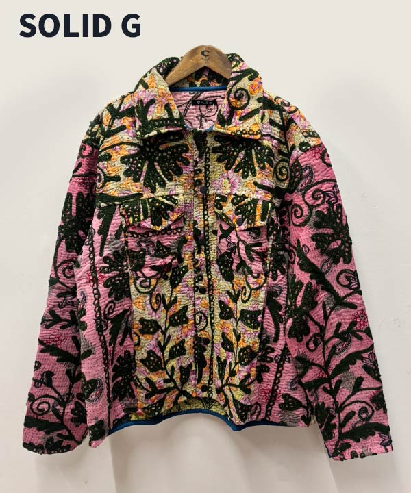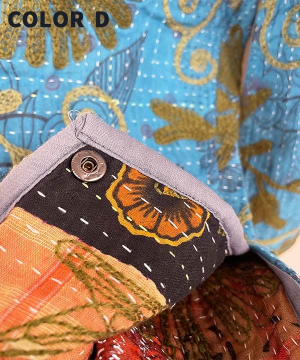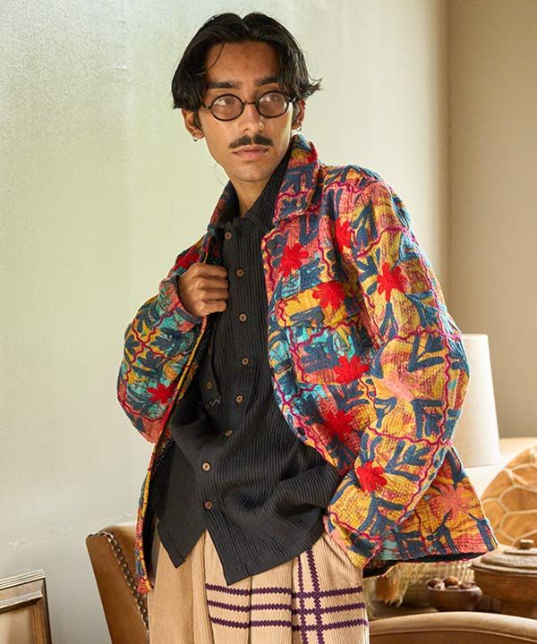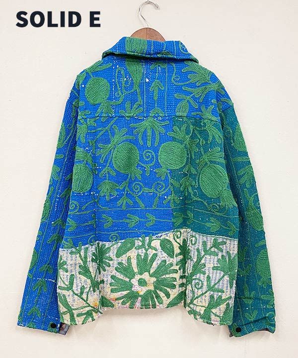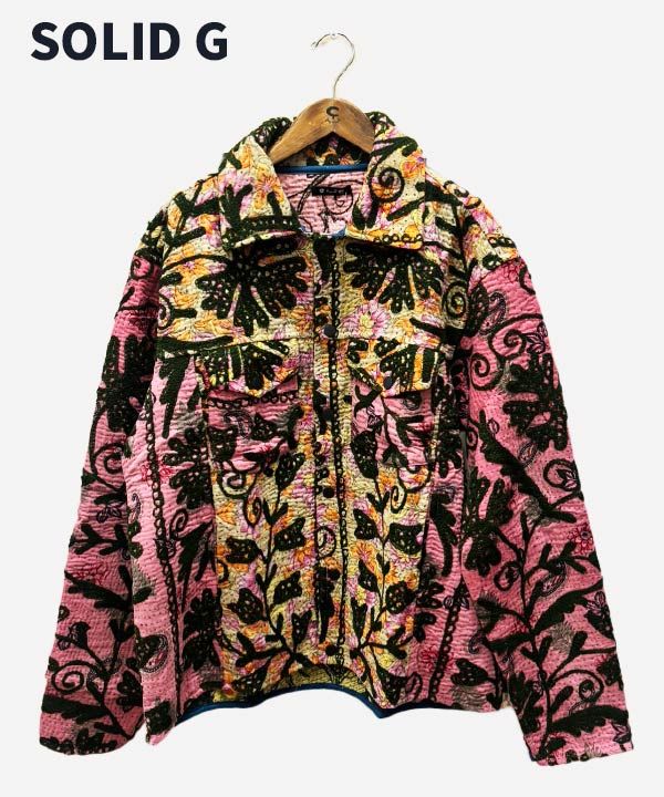 《世界に一つしかない一点もの》インドの約50〜70年前のビンテージ布「カンタ」をリユースして、刺繍と共にリメイクしたジャケット。「カンタ」とはインドなどで古くから伝わる伝統的な刺し子刺繍の布のこと。大切に使われた古布を重ねて刺し子刺繍を施すことで、より魅力的な新しい布として蘇ります。作り手の感性で新しく生まれ変わったジャケットは、一つとして同じものはありません。バイヤーがひとつひとつチェックし、この特別な一点ものジャケットを仕入れてきました。脈々と受け継がれる伝統、ハンドクラフトの魅力を贅沢に味わっていただける一点です。胸元と腰位置の左右にポケット付き。ぜひ裏地の柄まで存分にお楽しみください。