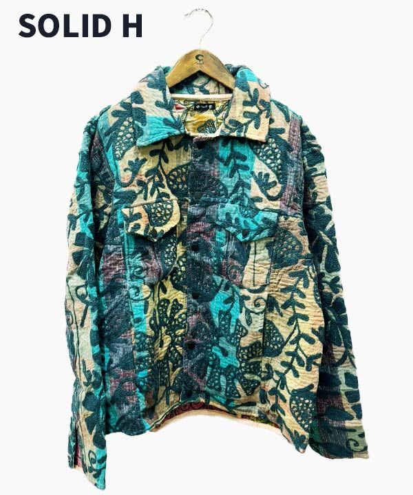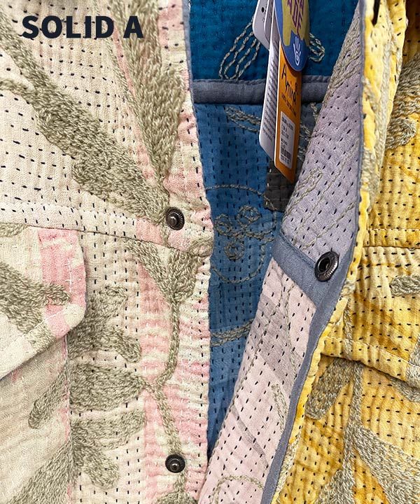 《世界に一つしかない一点もの》インドの約50〜70年前のビンテージ布「カンタ」をリユースして、刺繍と共にリメイクしたジャケット。「カンタ」とはインドなどで古くから伝わる伝統的な刺し子刺繍の布のこと。大切に使われた古布を重ねて刺し子刺繍を施すことで、より魅力的な新しい布として蘇ります。作り手の感性で新しく生まれ変わったジャケットは、一つとして同じものはありません。バイヤーがひとつひとつチェックし、この特別な一点ものジャケットを仕入れてきました。脈々と受け継がれる伝統、ハンドクラフトの魅力を贅沢に味わっていただける一点です。胸元と腰位置の左右にポケット付き。ぜひ裏地の柄まで存分にお楽しみください。