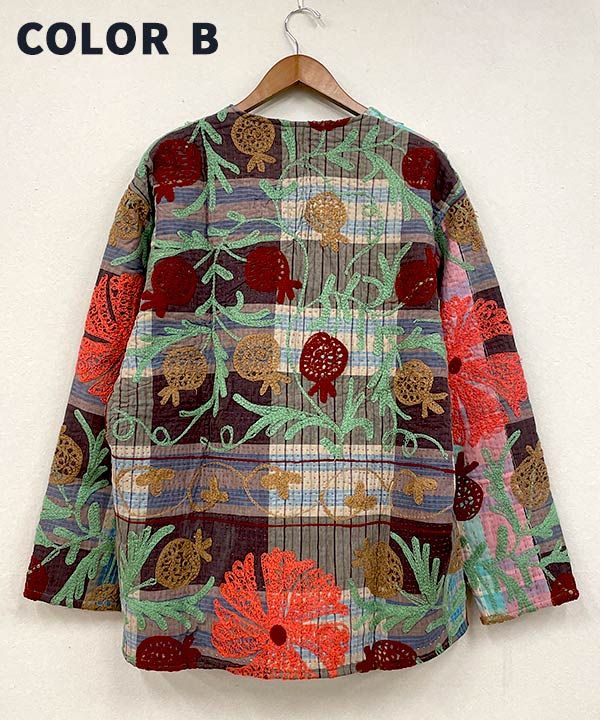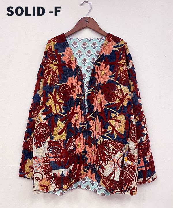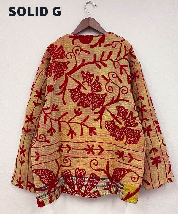 《世界に一つしかない一点もの》インドの約50〜70年前のビンテージ布「カンタ」をリユースして、刺繍と共にリメイクしたジャケット。「カンタ」とはインドなどで古くから伝わる伝統的な刺し子刺繍の布のこと。大切に使われた古布を重ねて刺し子刺繍を施すことで、より魅力的な新しい布として蘇ります。作り手の感性で新しく生まれ変わったジャケットは、一つとして同じものはありません。バイヤーがひとつひとつチェックし、この特別な一点ものジャケットを仕入れてきました。脈々と受け継がれる伝統、ハンドクラフトの魅力を贅沢に味わっていただける一点です。リバーシブルに着用可能。表地は左右にポケット付き。ぜひ裏地の柄まで存分にお楽しみください。