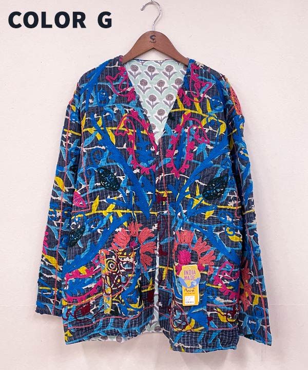 《世界に一つしかない一点もの》インドの約50〜70年前のビンテージ布「カンタ」をリユースして、刺繍と共にリメイクしたジャケット。「カンタ」とはインドなどで古くから伝わる伝統的な刺し子刺繍の布のこと。大切に使われた古布を重ねて刺し子刺繍を施すことで、より魅力的な新しい布として蘇ります。作り手の感性で新しく生まれ変わったジャケットは、一つとして同じものはありません。バイヤーがひとつひとつチェックし、この特別な一点ものジャケットを仕入れてきました。脈々と受け継がれる伝統、ハンドクラフトの魅力を贅沢に味わっていただける一点です。リバーシブルに着用可能。表地は左右にポケット付き。ぜひ裏地の柄まで存分にお楽しみください。