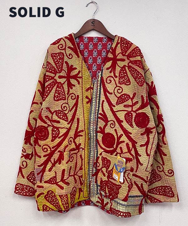 《世界に一つしかない一点もの》インドの約50〜70年前のビンテージ布「カンタ」をリユースして、刺繍と共にリメイクしたジャケット。「カンタ」とはインドなどで古くから伝わる伝統的な刺し子刺繍の布のこと。大切に使われた古布を重ねて刺し子刺繍を施すことで、より魅力的な新しい布として蘇ります。作り手の感性で新しく生まれ変わったジャケットは、一つとして同じものはありません。バイヤーがひとつひとつチェックし、この特別な一点ものジャケットを仕入れてきました。脈々と受け継がれる伝統、ハンドクラフトの魅力を贅沢に味わっていただける一点です。リバーシブルに着用可能。表地は左右にポケット付き。ぜひ裏地の柄まで存分にお楽しみください。