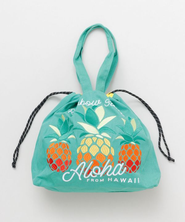ハワイの風景やモチーフを刺しゅうで表現したトート。巾着型の口なので絞っても、そのままでも使えます。カラフルな配色と、ハワイの人気モチーフが元気を与えてくれる。内ポケットつき。