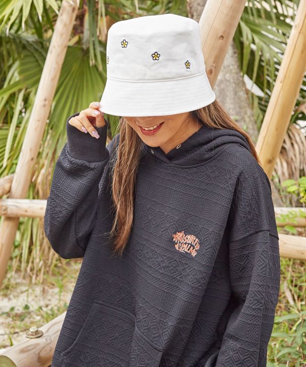 プルメリア刺しゅうがちりばめられたハット。プルメリアはハワイでは「神が宿る花」とも呼ばれていて、身に付けることで幸せが訪れると信じられています。あなたもプルメリアを身に付けてお出かけしよう。