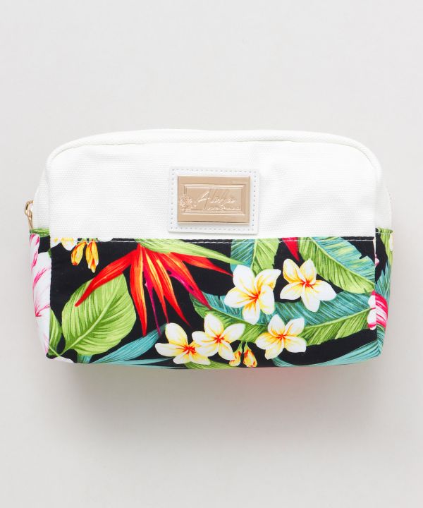 ハワイから輸入した色鮮やかな生地を使用したポーチ。大容量サイズでマチがついておりバッグ内の整頓にもおすすめです。
