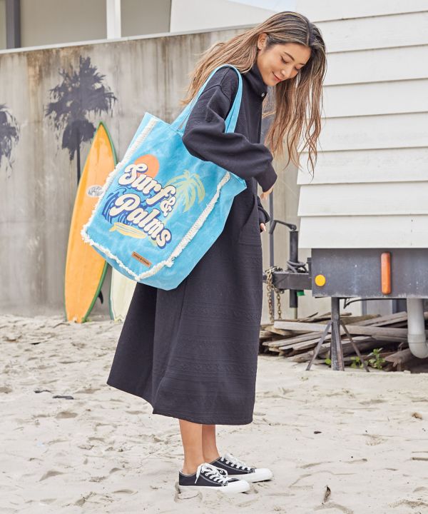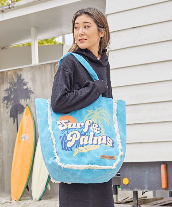 デニム風生地の大判トート。サーフカジュアルテイストで着替えやタオルもしっかり入るサイズ感。サイドのフリンジが夏を演出してくれる。サーフにも買い物のお供にもおすすめです。