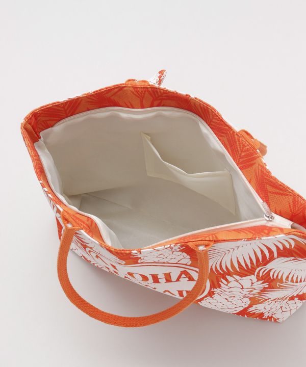 配色がかわいい大容量のバッグとポーチのセット。ハワイを連想させるデザインが発泡プリントで施され,お出かけをより一層楽しくさせる。開口部はファスナーつきで安心のデザイン。内ポケット付き。