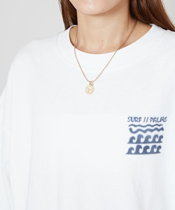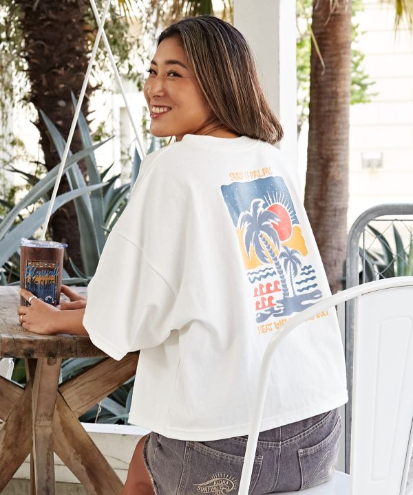 サーフシーンをベースにしたレトロなアートが描かれたプリントTシャツ。カラフルな配色とユーモラスなタッチのアートが、私たちをロコ気分にさせてくれます。柔らかな綿素材で、夏にさらっと着られる一枚です。