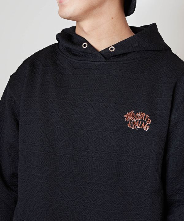 ネイティブ風の柄と胸元の刺しゅうがポイントのフード付メンズトップス。ストレッチ性のあるふくれジャカード素材と、フード裏の同系色のパイル生地が気持ち良い一枚です。ゆったりとしたシルエットでユニセックスでも着用できます。メンズハーフパンツとのセットアップもおすすめです。
