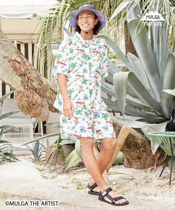 【Kahiko×MULGA THE LIFE】オーストラリアで大人気のアーティスト【MULGA/モルガ】とのコラボメンズ開襟シャツが登場。ポップでキュートなデザインが様々な年代からの人気を集めています。陽気なキャラクターたちが日常にハッピーな気分をもたらしてくれます。ハーフパンツとのセットアップもオススメ。