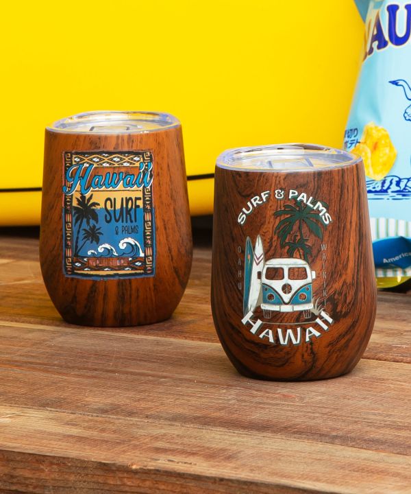 ビンテージ風にハワイのビーチのサーフシーンを表現したミニサイズのタンブラー。ウッドデザインがハワイのサーフシーンを彷彿とさせる。生活のワンシーンにハワイの彩りを。