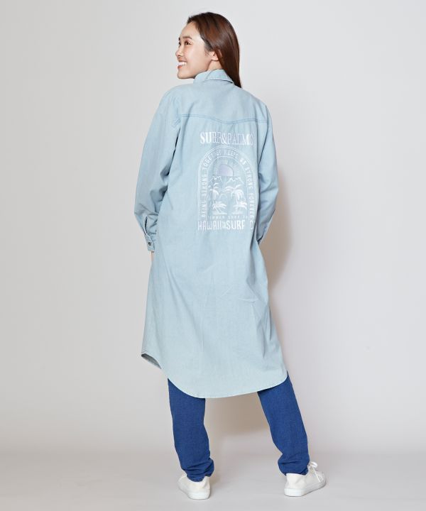 加工感のある風合いな薄手のデニムシャツワンピース。胸ポケットのワッペンと後ろの刺しゅうがサーフスタイルにぴったり。ボタンを開けてカーディガンのようにも羽織るのもおすすめです。