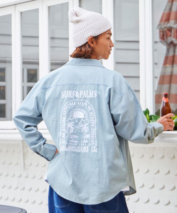 加工感のある風合いな薄手のデニムメンズシャツ。胸ポケットのワッペンと後ろの刺しゅうがサーフスタイルにぴったり。ボタンを開けてカーディガンのようにも羽織るのもおすすめです。
