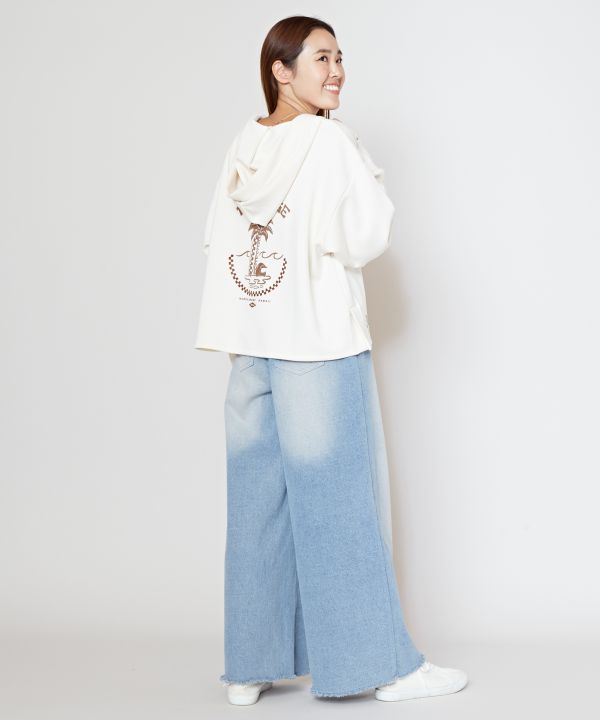 ストレッチ性のあるダンボールニットのフード付きトップス。胸元、袖口、裾、背中の4ヶ所にハワイを感じるデザインのプリントがされています。発泡プリント&フロッキープリントがコーデのアクセントに。