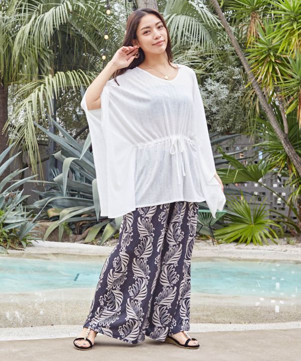 程よい厚みと伸縮性のある生地を使用した着心地抜群なカットソー素材のフレアパンツ。ハワイを連想させるボタニカル柄と爽やかなカラーバリエーションでコーデを華やかにしてくれます。ウエストゴム付きでしわになりにくい素材のため、旅行にもぴったりな一枚です。