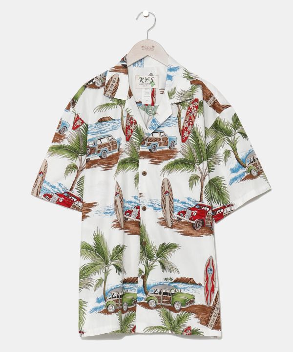 ハワイから届いたメンズアロハシャツ。クラシックなウッディーカーとサーフボードが描かれたデザインは、ハワイのビーチカルチャーを感じさせる一枚です。綿100%のさらりとした素材で肌触りが良く、快適な着心地。ボタンがココナッツで出来ているのもポイントです。リゾートはもちろん、カジュアルスタイルにも映えるアロハシャツです。