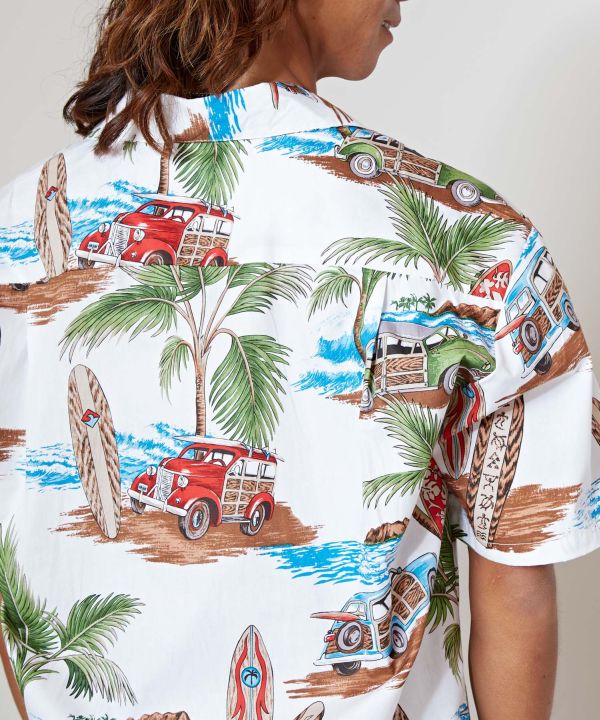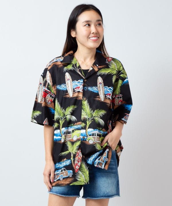 ハワイから届いたメンズアロハシャツ。クラシックなウッディーカーとサーフボードが描かれたデザインは、ハワイのビーチカルチャーを感じさせる一枚です。綿100%のさらりとした素材で肌触りが良く、快適な着心地。ボタンがココナッツで出来ているのもポイントです。リゾートはもちろん、カジュアルスタイルにも映えるアロハシャツです。