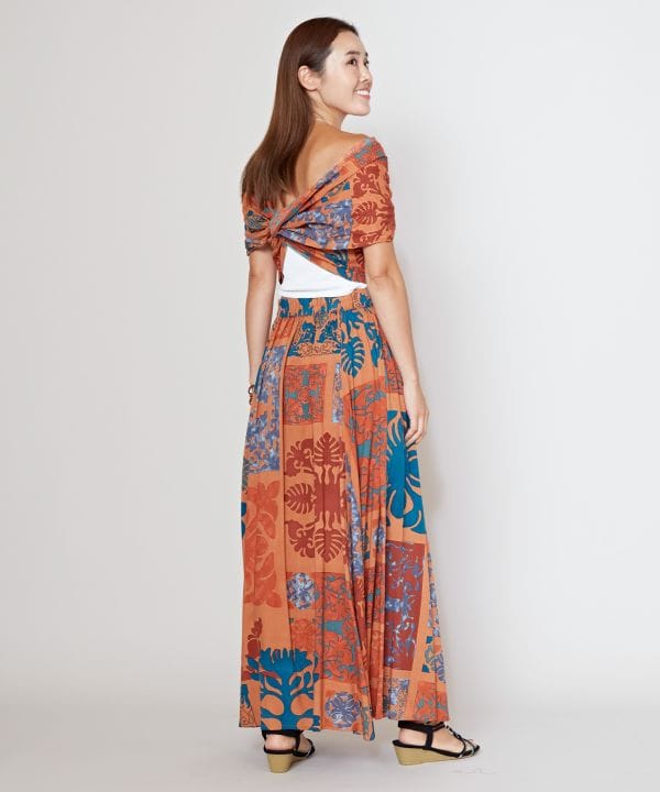 ハワイアンキルト柄をプリントしたサッシュスカート。素肌に心地よいレーヨン素材です。リゾートやカジュアルのどちらでも着れるデザインが目を惹きます。30通りもの豊富な着方ができるサッシュスカートで自分に似合う「新しい美」を探してみては。お出かけだけでなくリゾート挙式にも着ていただける万能アイテムです。