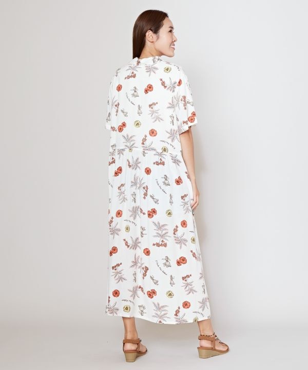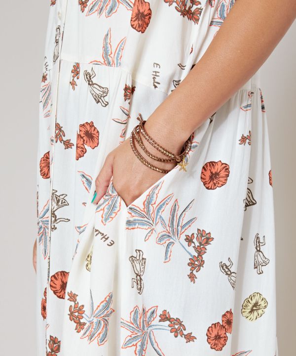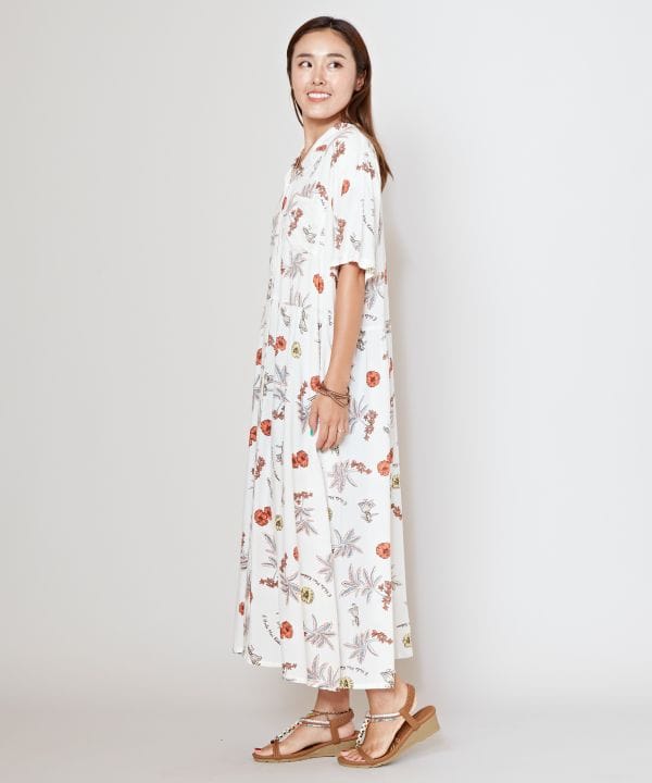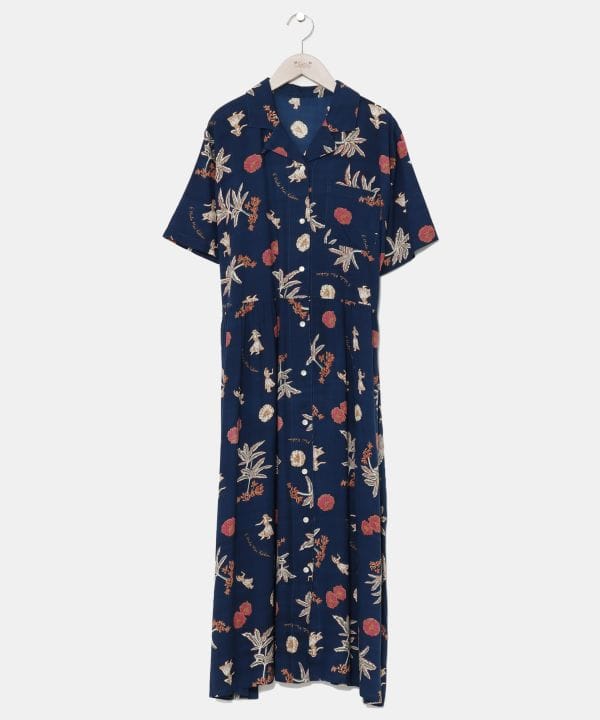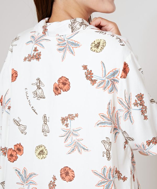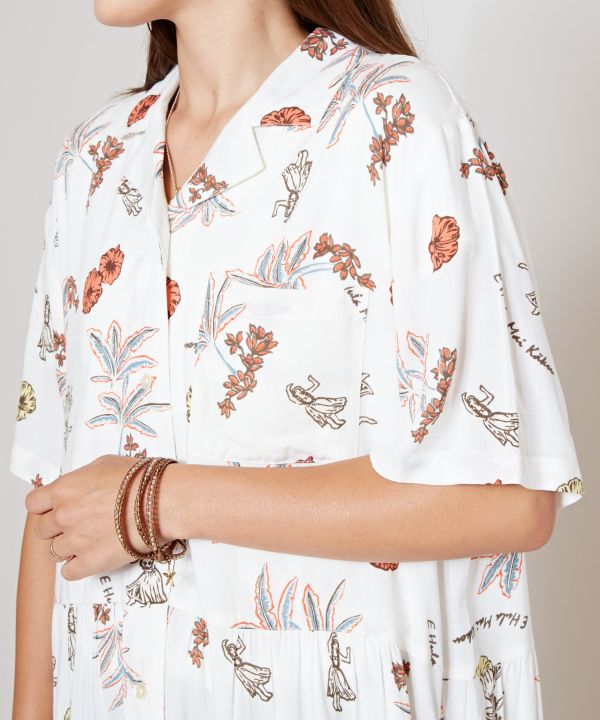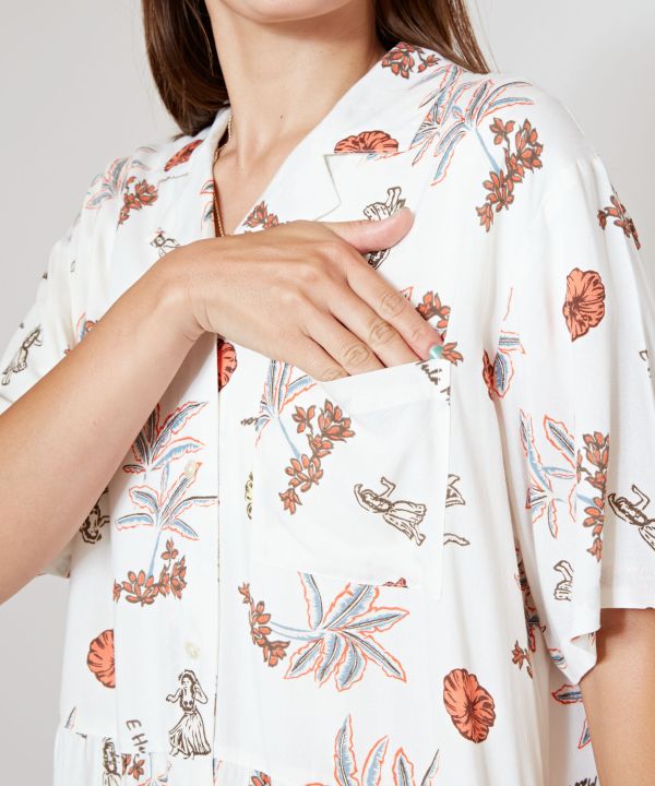 ハワイのイメージが描かれたチャプスイ柄のシャツワンピース。ナチュラルでヴィンテージ感のあるデザインです。レーヨン素材でさらっと着られるため、ボタンを開けて羽織るのもおすすめ。