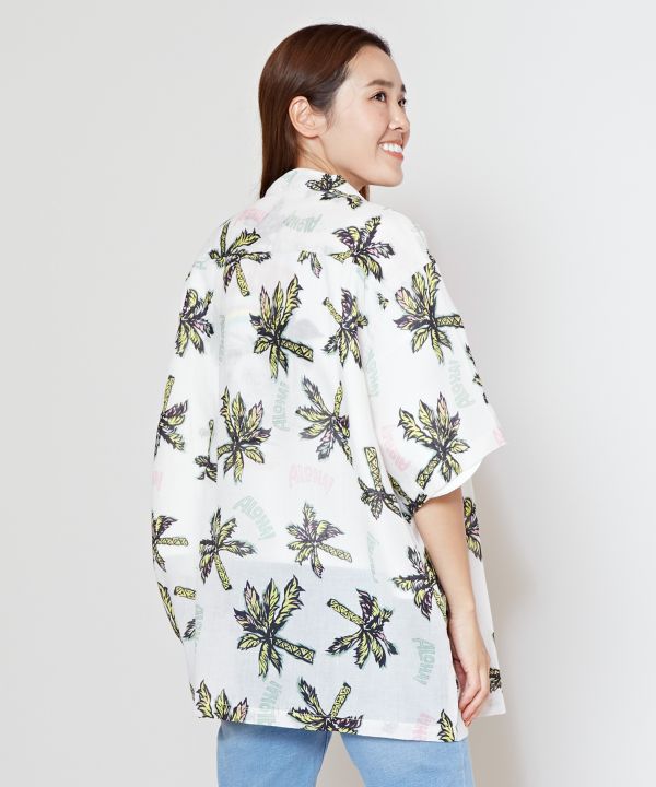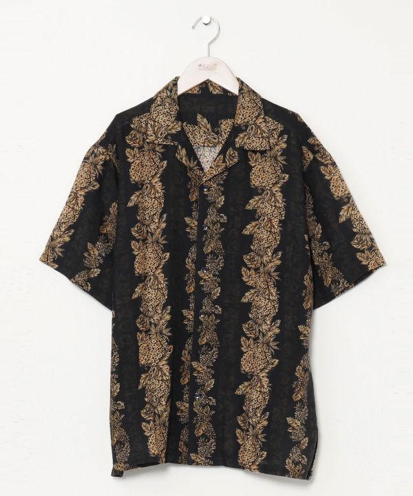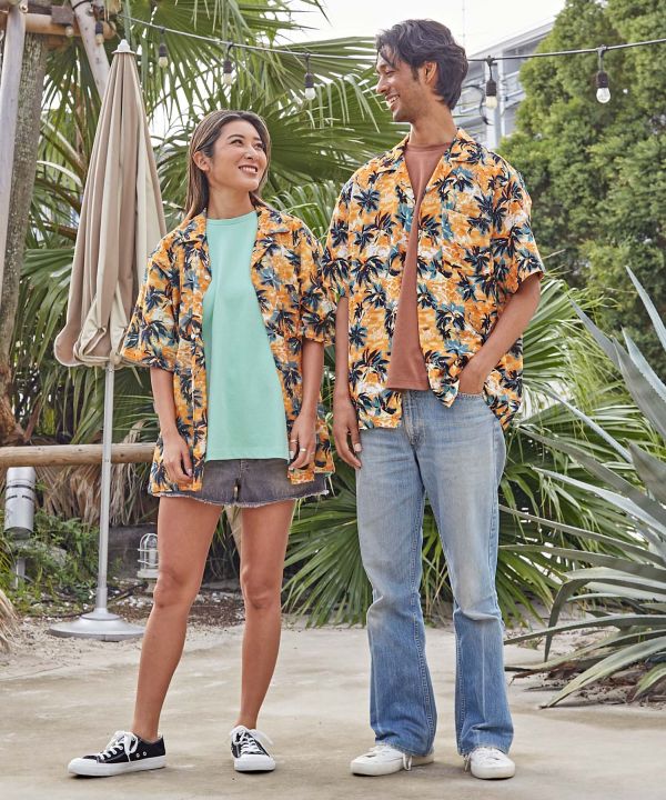 パイナップルやパームツリーなどのハワイアン柄がプリントされたアロハシャツ。薄手で軽やかな綿素材で、暖かい季節に活躍します。シャツを収納できるサイズ感の巾着バッグつきで、持ち運びに最適です。