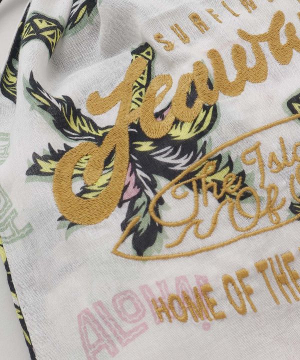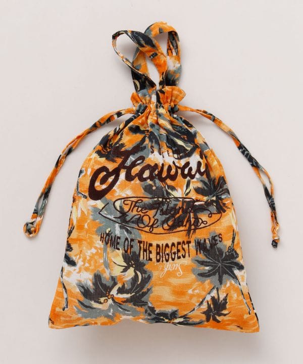パイナップルやパームツリーなどのハワイアン柄がプリントされたアロハシャツ。薄手で軽やかな綿素材で、暖かい季節に活躍します。シャツを収納できるサイズ感の巾着バッグつきで、持ち運びに最適です。