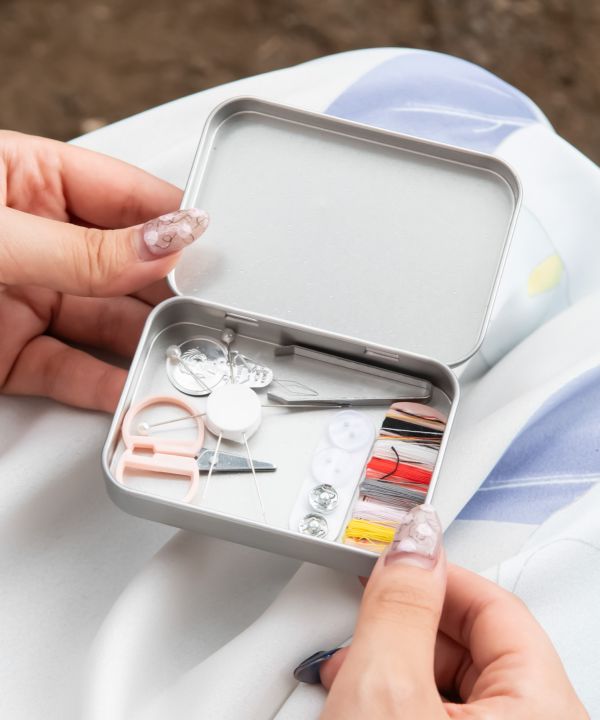 昔の針入れをイメージしたレトロなデザインの携帯裁縫缶。ちょっとしたトラブルを助けてくれる優れもの。中には、針/糸/はさみ/ピンセット/ボタン/安全ピン/糸通しが入ってます。