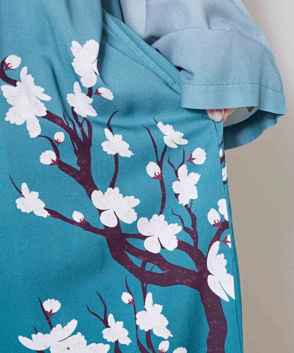 カシュクール型の長丈羽織。大胆に描かれた梅の柄と淡い色合いがやさしい印象を与え、結び紐を用いれば着物風の装いもお楽しみいただけます。レーヨン素材の軽やかな生地で涼しく、UVカット加工が施されているため日除けとしても活躍します。春のお出かけにおすすめの上品な羽織です。