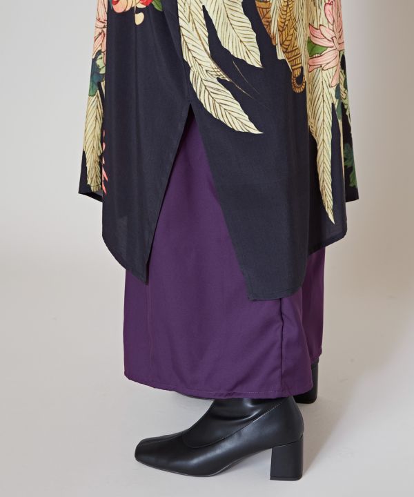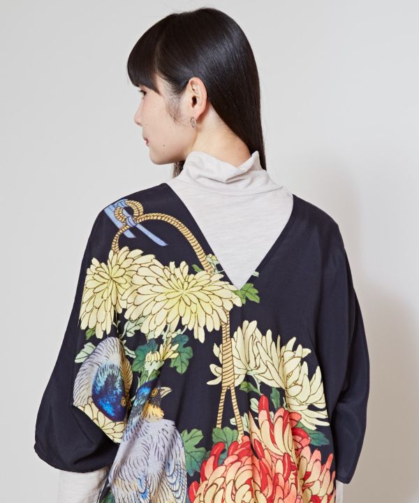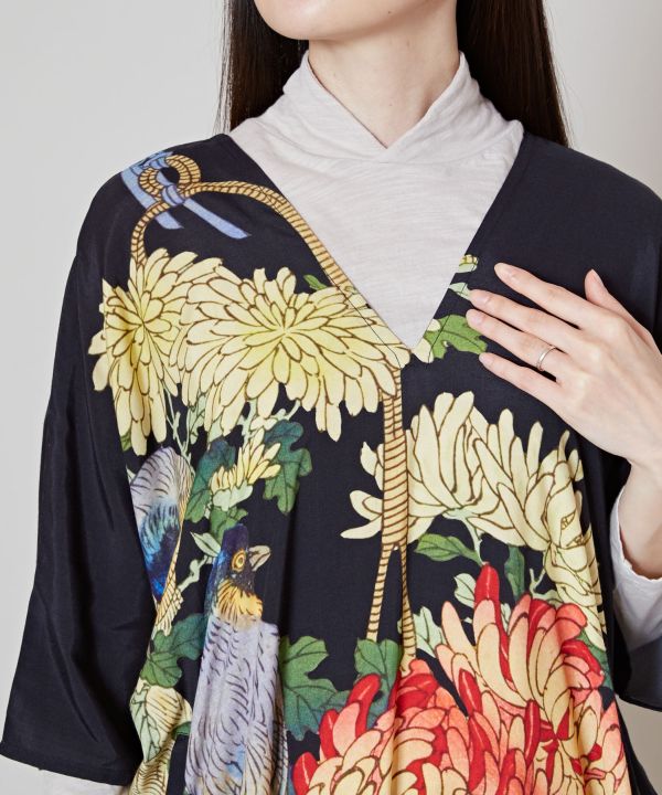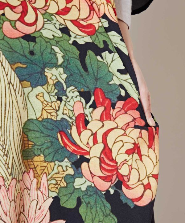 大胆な花鳥画が目を惹く薄手のワンピース。江戸から明治にかけて活躍した日本画家・幸野楳嶺(こうのばいれい)の「楳嶺花鳥画譜(ばいれいかちょうがふ)」をもとにしたプリントが華やかです。レーヨン素材で涼しく快適な着心地。首まわりが広くゆったりとした形で体型を気にせず着られ、両サイドにポケットも付いています。