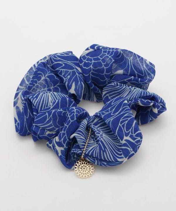 咲き誇る花々を大胆かつポップにデザインしたシュシュ。ゴールドの花飾りをアクセントに。ふんわりとしたポリエステル素材で、髪をまとめやすく仕上げました。