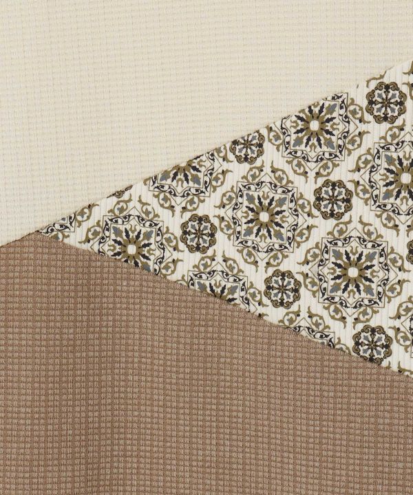 配色と柄の切替が個性的なレディーストップス。ゆるっとしたビッグシルエットと七分袖で季節の変わり目にも活躍。快適でラフな着心地も魅力。