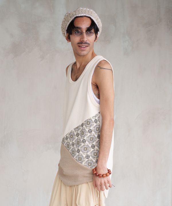 大胆な切り替えデザインが映えるメンズタンクトップ。表情のある生地がラフなスタイルにマッチ。ユニセックス仕様でスタイリングの幅も広がるデザイン。