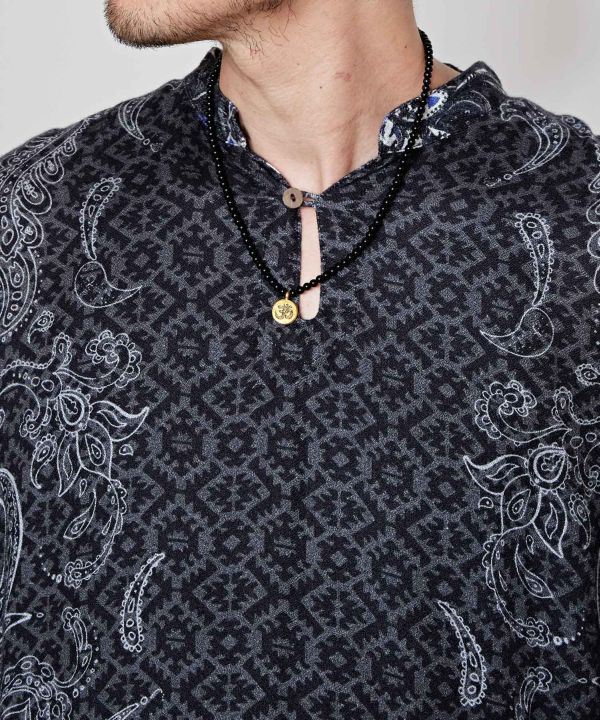 インドネシアの伝統的なろうけつ染め「バティック」をイメージした柄デザインのメンズトップス。さらりとした肌触りが心地良い、レーヨンモス素材。滑らかで落ち感のあるシルエットと大胆なペイズリー柄が特徴的な一枚です。