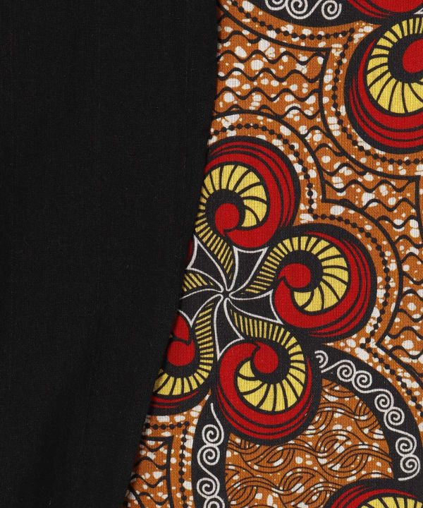 アフリカのキテンゲモチーフの柄を使用した、無地×柄の切り替えが楽しいメンズパンツ。サイドの紐を絞ってシルエットの変更が可能。目が粗い生地で涼しく着られる一着。右後ろとサイドにポケット付き。ラフィキはスワヒリ語で「友達」という意味。