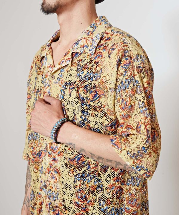 インドのペイズリーや花柄をプリントしたメンズシャツ。トレンド感のある涼し気レース素材に注目。レイヤードスタイルや羽織として、コーデが楽しめる一品。