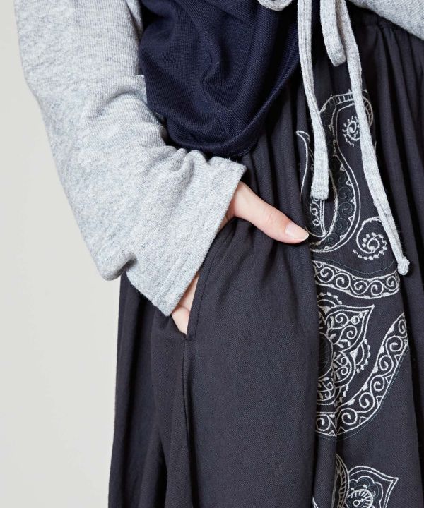 ヘナタトゥーのモチーフを刺しゅうであしらったバルーンスカート。刺しゅうには葉、花、ペイズリーが入っており、生命力や活気、幸福などの意味があります。肌触りのいい綿素材で着心地も抜群の一枚。