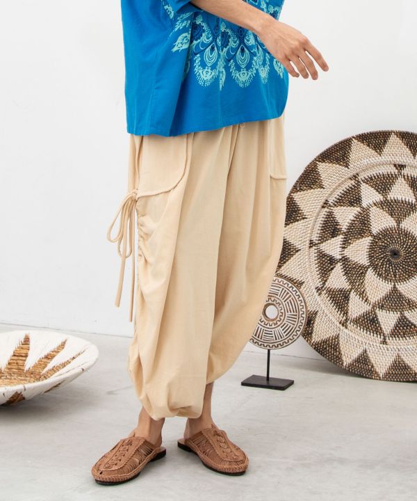 肌触りの良いカットソー素材で着心地抜群な変形パンツ。サイドのドローストリングでボリューム調整も可能。シンプルながらユニークなデザインで、ラフでモードな着こなしに。