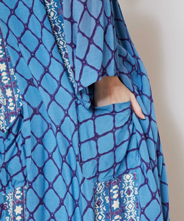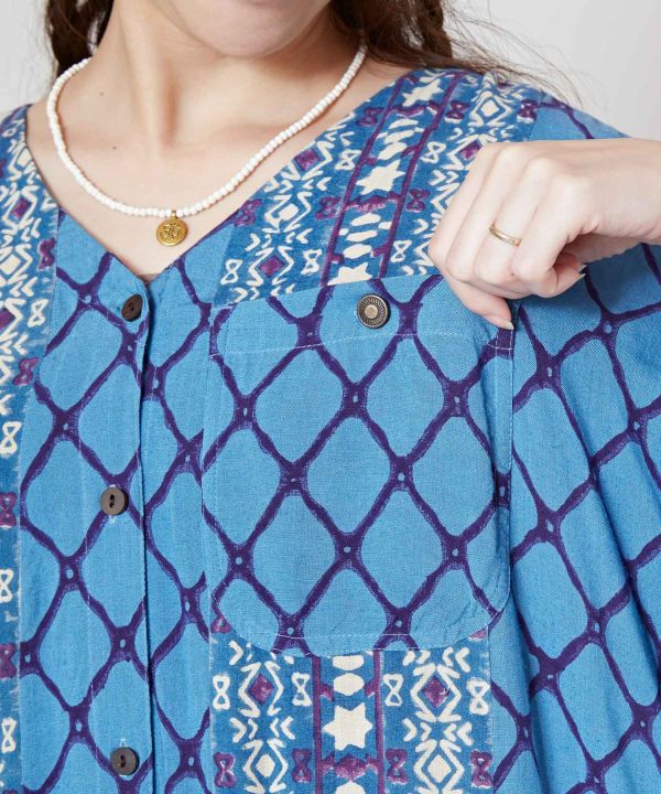 インド綿素材のワンピースにもなるロングシャツ。シルクロードの交易品モチーフをブロックプリントしたシリーズ。メタルボタンがポイント。それぞれの柄の由来は【WHITE】紅花&綿、【BLUE】壁タイル&ガラス工芸【GREEN】汗血馬【YELLOW】食器&調味料