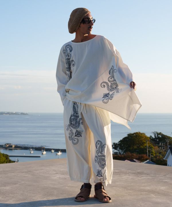 肌触りのいい綿素材を使用したメンズバルーンパンツ。ヘナタトゥーのモチーフ、葉・花・ペイズリーを刺しゅうで施し、表現、生命力や活気、幸福などを表現。ウエストの紐でサイズ調節可能。