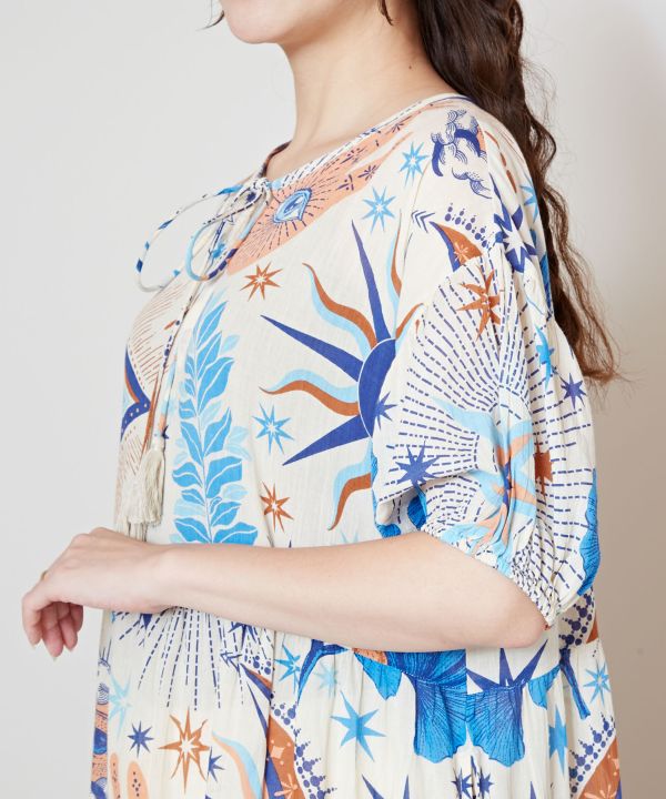 薄く肌触りのいい綿素材のワンピース。目や手、太陽や植物などユニークで特徴的な柄がプリントされたデザインが魅力。透け感があるので重ね着コーデもおすすめ。ボリュームのあるティアード型がポイント。