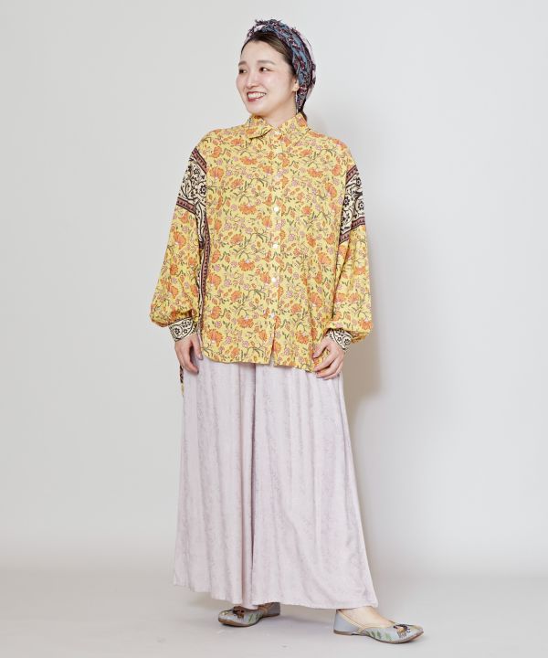 柄の切り替えが個性的なレディースシャツ。ブロックプリント風の暖かい花柄が魅力的。カジュアルにも着られる万能シャツ。