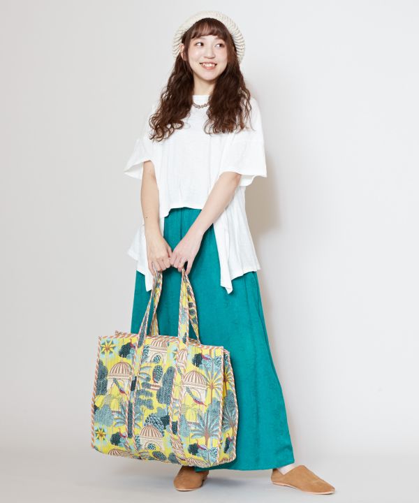 インドならではの孔雀や植物が描かれた柄のキルティングトート。 リバーシブルで両面でも使用可能。内側ポケット付きで、スマホなども取り出しやすい。 軽量の綿素材で普段のお買い物はもちろん、イベントやフェスにも活躍できます。
