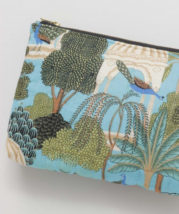 インドならではの孔雀や植物が描かれた柄のキルティングポーチ。内側にポケットがあり、 軽く、マチ付きで大容量。 日常使いはもちろん、旅先も大活躍のアイテム。