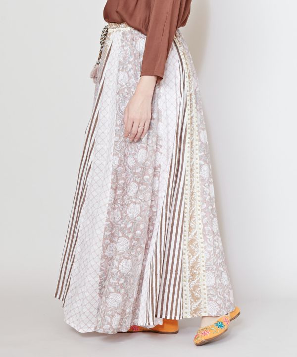 繊細に織り上げられたドビー生地を使用したスカート。ウズベキスタン・サマルカンドの、ラピスラズリとトルコ石で表現された建築デザインからインスピレーションを受けデザイン。美しい石とタイルの陰影をブロックプリントで表現しました。複雑に入った切り替えで、すっきりとした美しいシルエットを作ります。