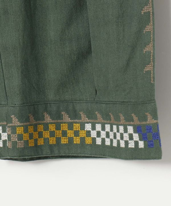 ボリュームのあるバレルシルエットが新鮮なパンツ。 ウズベキスタンの民族衣装、チャパンからインスピレーションを受けデザイン。センターの幅広タックがスタイルよく見せます。ポケットのタッセル、チャパンで使われるモチーフの刺しゅうでゴージャスな印象に。 素材は織機にこだわり、素朴なスラブコットン織りを使用。